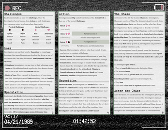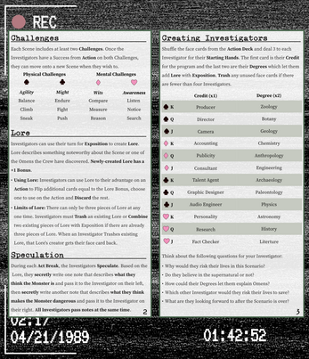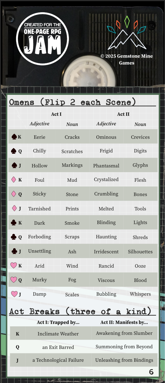 Found Footage is a GM-less game of horror perfect for one shots. All you need to play are two decks of playing cards with different backs. The players improvise together across three Acts, with the horror steadily growing as players use Exposition to add more Lore to the Scenario and Speculate on what the Monster could be.